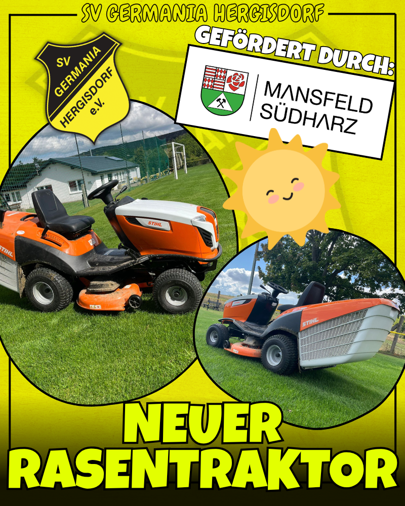 Der SV Germania Hergisdorf e.V. darf sich seit Kurzem über einen neuen Rasentraktor freuen! Unser bisheriger Traktor lieferte jahrelang verlässliche Arbeit, aber hatte in letzter Zeit immer wieder mit Altersbeschwerden zu kämpfen. Aus diesem Grund ist es umso schöner, dass wir nun einen neuen Rasentraktor von der Firma Stihl auf dem Kulch begrüßen dürfen!😍