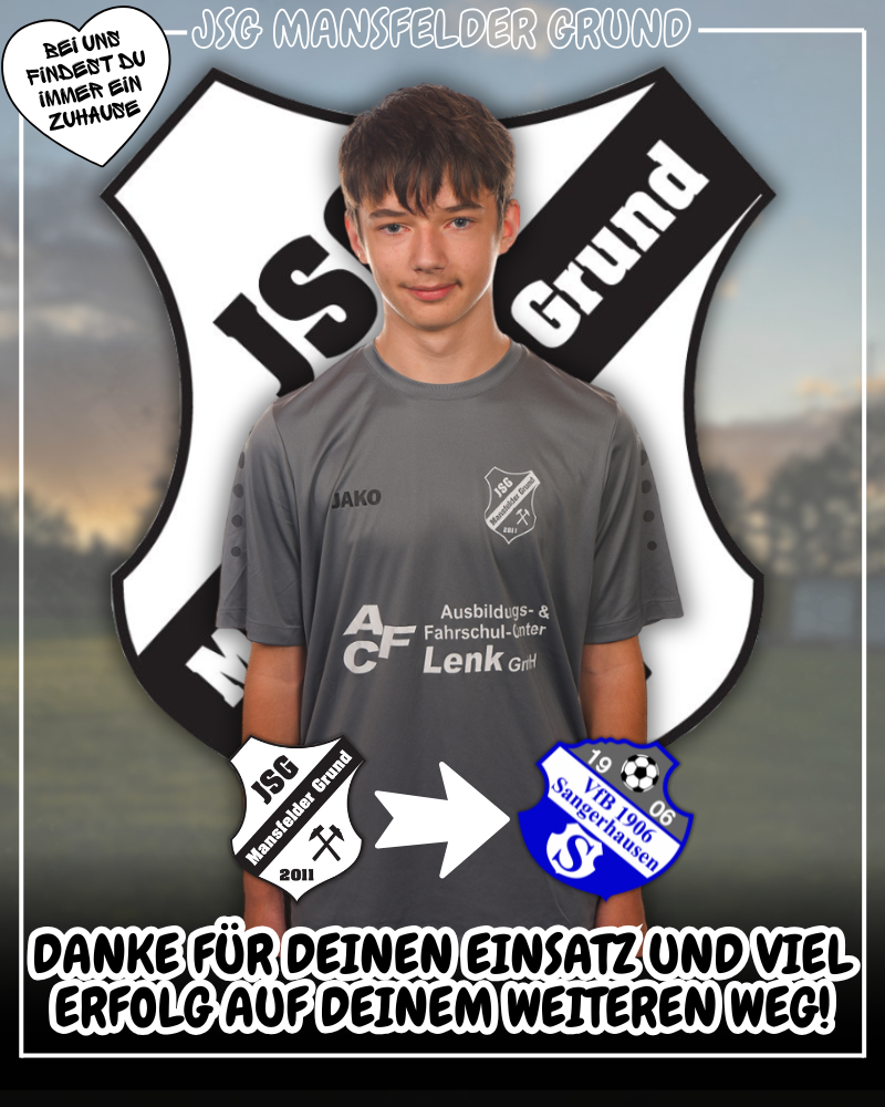 Nun erfolgt der Wechsel zum VfB Sangerhausen. Wir bedanken uns für knapp vier Jahre vollem Einsatz mit dem JSG-Wappen auf der Brust. Hoffentlich kannst du dich schnell und gut in der Rosenstadt integrieren! Dabei wünschen wir dir viel Erfolg! Auch sein „ehemaliger“ Coach Thomas wünscht ihm viel Glück! Da können wir uns nur anschließen! Mach’s gut, bis bald! Wir wünschen dir nur das Beste!