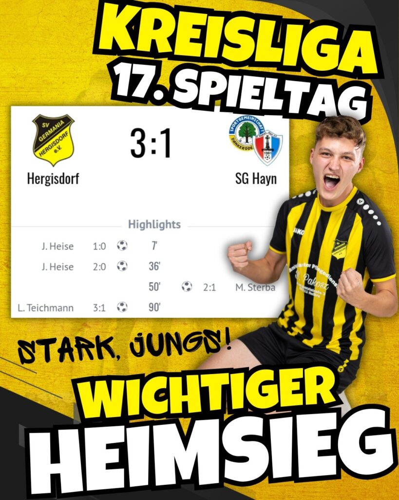 WICHTIG! Unsere Germanen erkämpfen sich auf dem Kulch drei Punkte gegen die SG Hayn/Dankerode. Gerade im ersten Durchgang hätte man das Ergebnis deutlicher gestalten können, aber nutzte die zahlreichen Gelegenheiten nur zweimal. Egal, die drei Zähler bleiben in Hergisdorf und das ist das Wichtigste heute!![]()